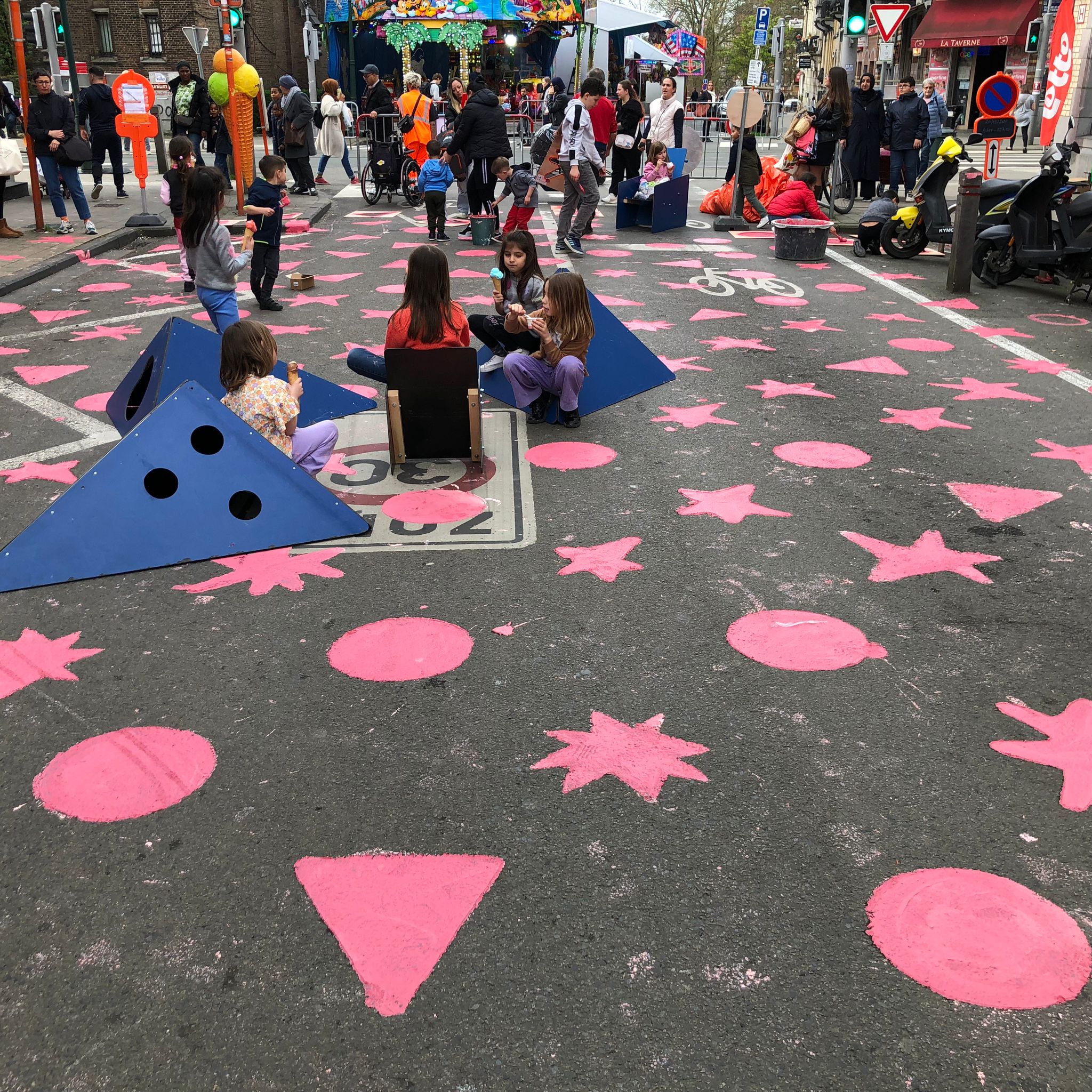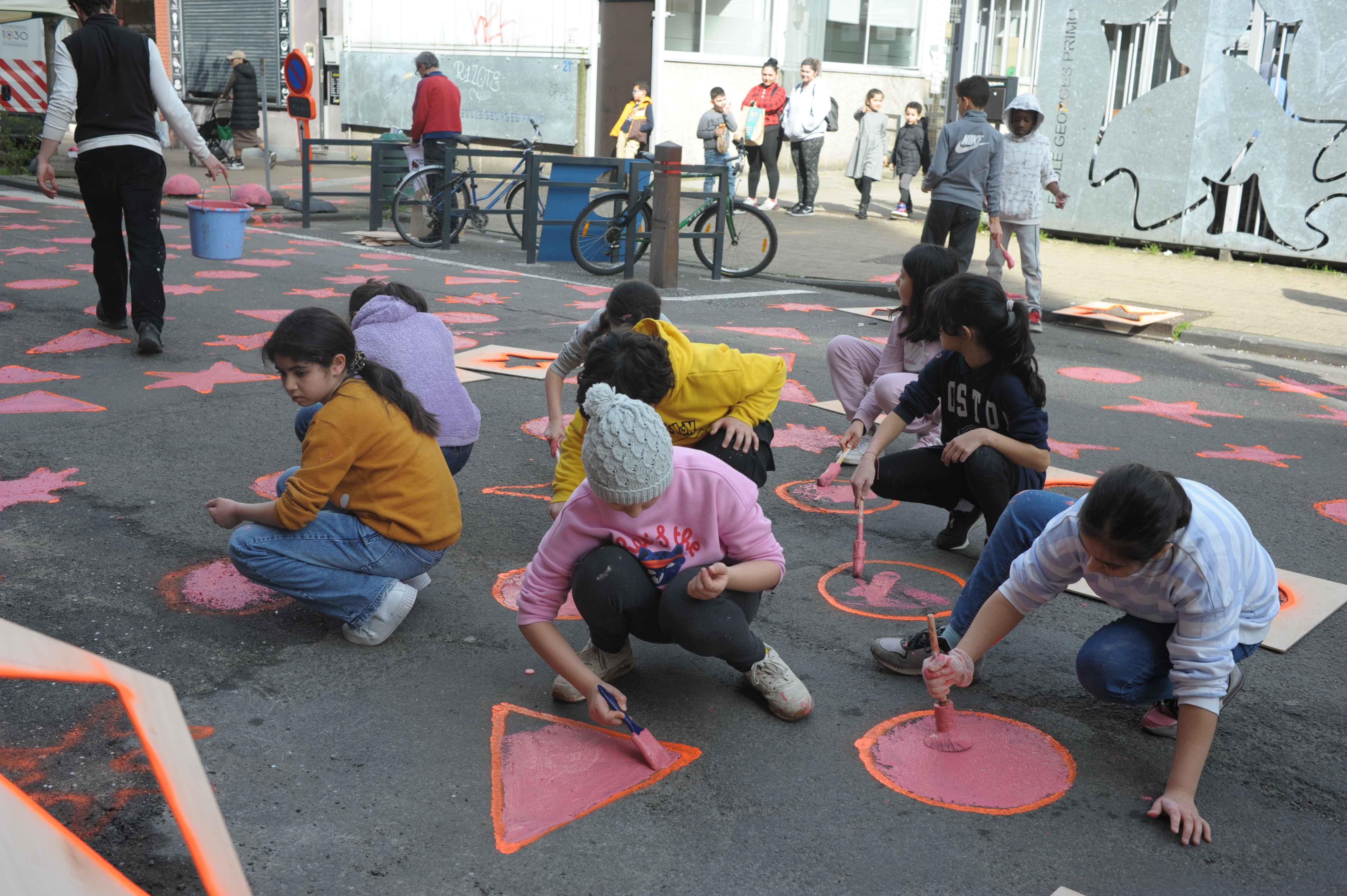 In de volgende workshops testten we de voorstellen van het ontwerpteam die aangesteld werden voor de herinrichting van de straat. Hun ideeën werden door de kinderen op ware grootte op de straat geschilderd, herdacht en aangepast. We stelden ook voor een aantal modules ontwikkelen die als stapstenen doorheen de straat geplaatst kunnen worden - mobiele tetraëders die als communicatiedrager in de straat kunnen dienen, maar op andere momenten verplaatst en getransformeerd kunnen worden tot zitbanken, podium, zandbak of mobiele straatafsluiting, naargelang de noden. Andere ateliers zullen zich richten op de routes van en naar school en de connecties met de andere actoren in de straat (school, horeca,..).